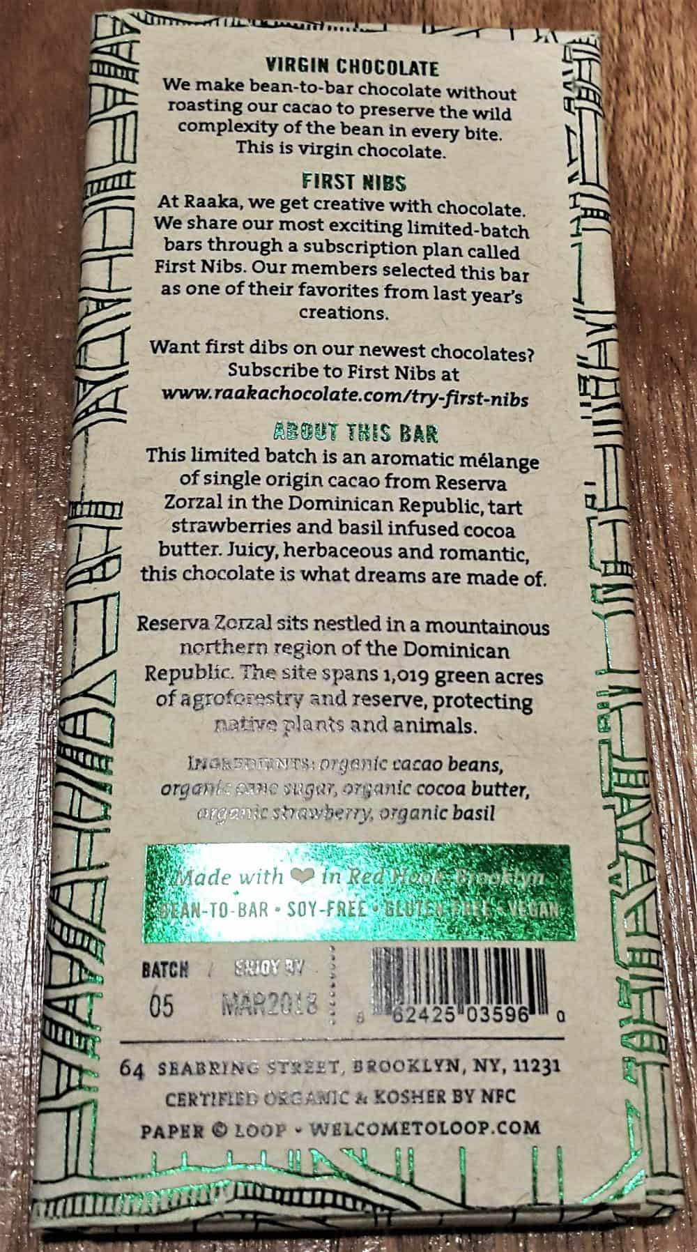 Ingredients: Organic Cacao Beans, Organic Cane Sugar, Organic Cocoa Butter, Organic Strawberry, Organic Basil.